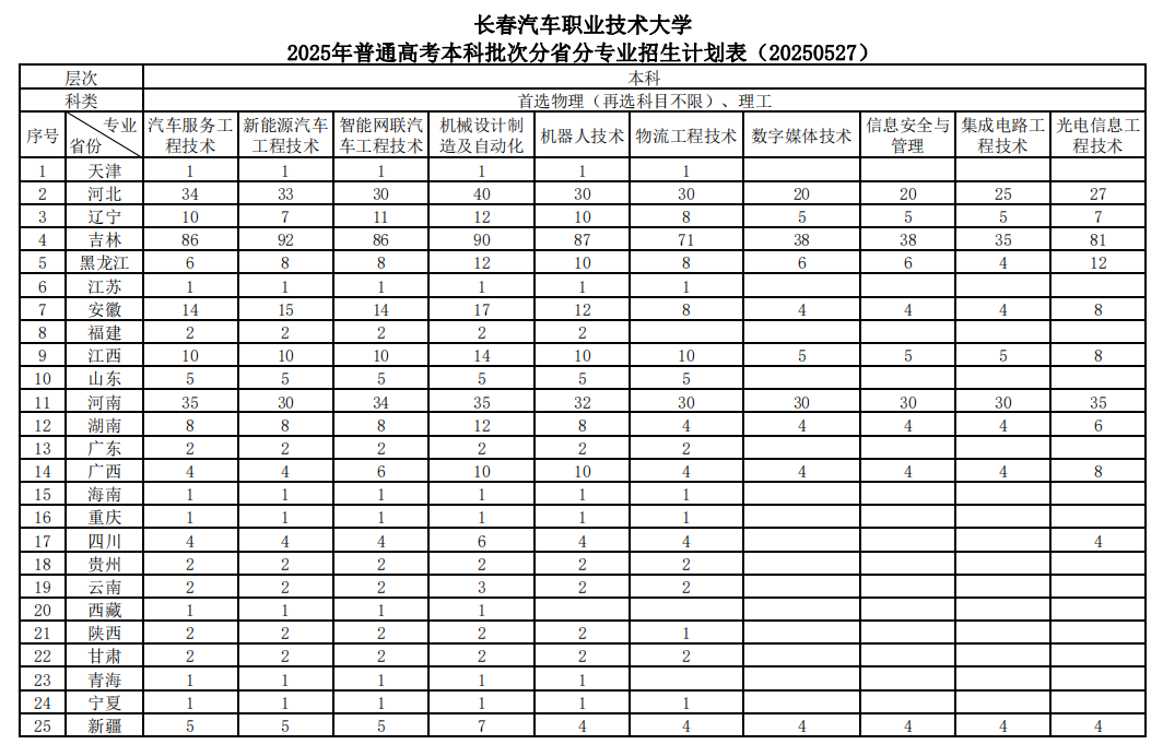 长春汽车职业技术大学2025年普通高考本科批次分省分专业招生计划表